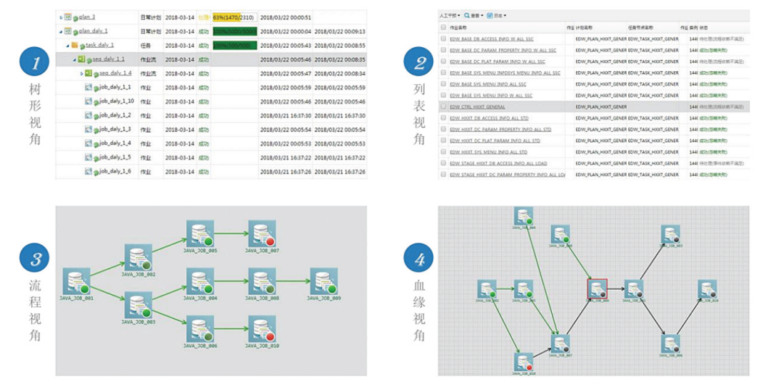 对于银行组织而言,当一个全行级的统一调度平台建设完成,通常会被移交给运维部门,并要求统一调度平台具备全方位的监控能力及便捷高效的运维手段,可以对调度运行状况进行全方位监控(包括调度各个层级的监控、所有调度作业的监控、调度流程的监控以及血缘视角的监控等),以节省运维部门在人力、物力上的投入。调度全方位监控如图3所示。